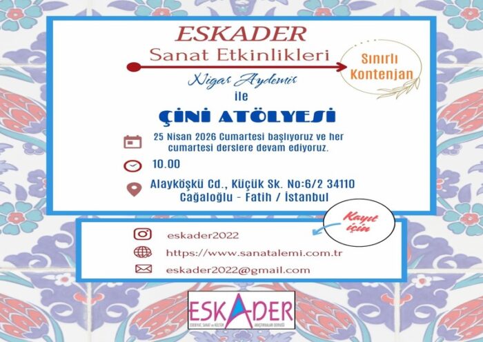Geleneksel sanatımızın zarif dokunuşlarıyla tanışmaya ne dersiniz? Eskader Sanat Etkinlikleri kapsamında düzenlediğimiz Çini Atölyesi derslerimiz 25 Nisan’da başlıyor. Bu büyülü yolculuğa ortak olmak isteyen tüm…