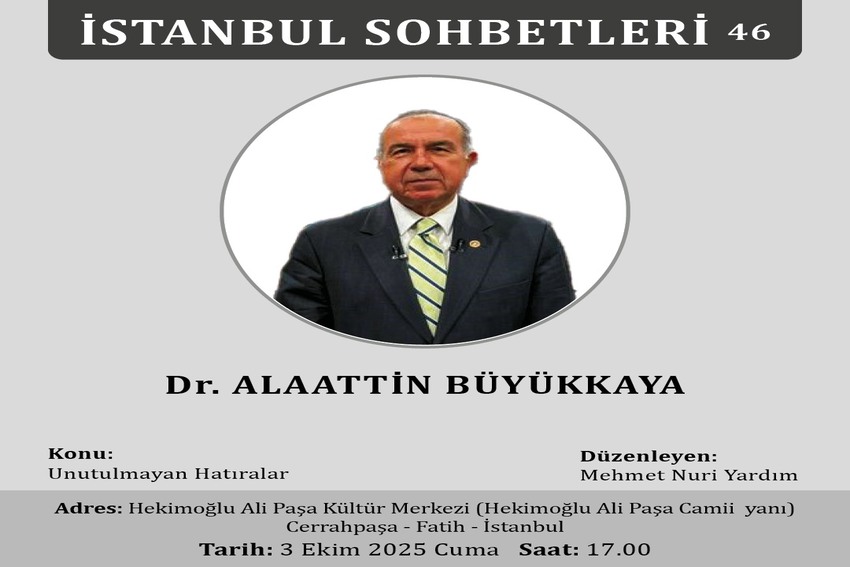 Büyükkaya, iş hayatı boyunca yakınlarında bulunduğu ve dostluk kurduğu Fethi Gemuhluoğlu ve Ergun Göze gibi iman, fikir ve dava adamlarıyla yaşadığı mühim hatıraları dile getirecek. Hekimoğlu Ali Paşa Camii Külliyesi içinde bulunan Hekimoğlu Ali Paşa Kültür Merkezi’nde gerçekleşecek olan sohbet toplantısı, bugün (3 Ekim 2025 Cuma) saat 17.00’de başlayacak. Alaattin Büyükkaya’ya televizyon programcısı Fehmi Atay da eşlik edecek. Her ayın ilk cuma günü yapılan ve 46’ncısı gerçekleşecek olan “İstanbul Sohbetleri”ni Mehmet Nuri Yardım düzenliyor. Toplantının sonunda bütün dinleyicilere kitap hediye ediliyor.