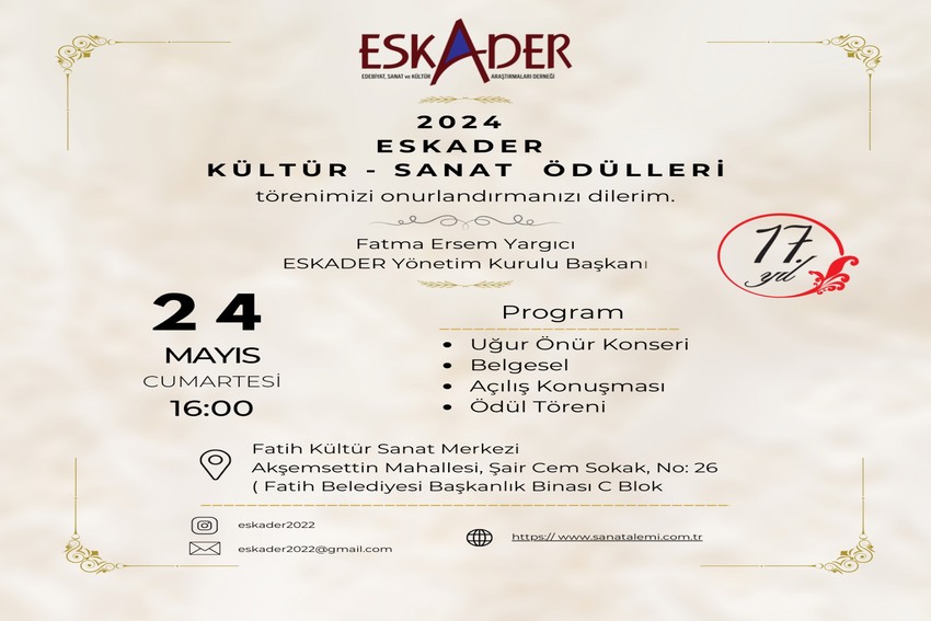 ESKADER 2024 yılı ödülleri takdim törenimiz, 24 Mayıs 2025 Cumartesi günü Fatih Belediyesi Kültür ve Sanat Merkezi’nde saat 16:00’da olacak.