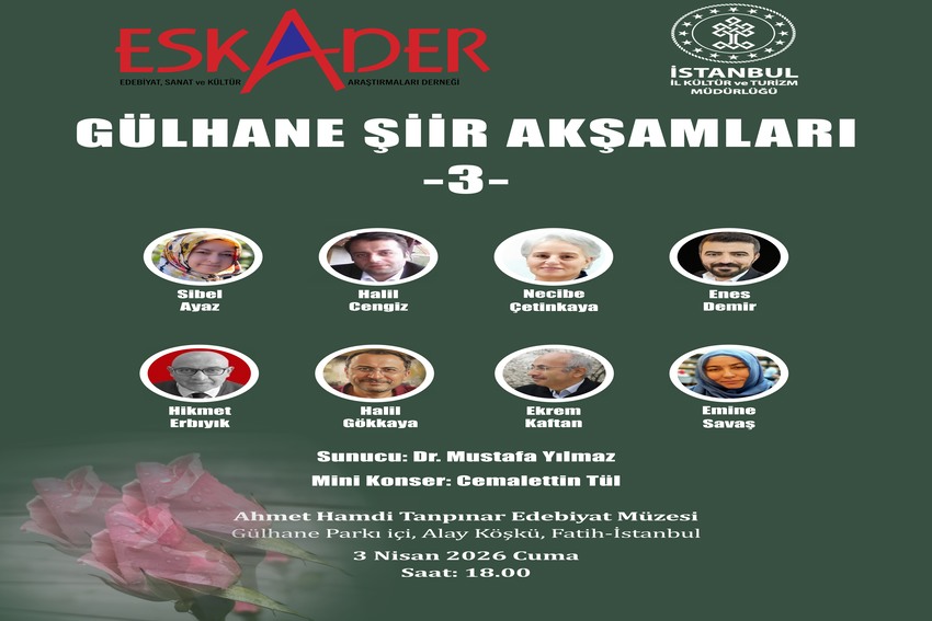 İstanbul İl Kültür ve Turizm Müdürlüğü ile Edebiyat, Sanat ve Kültür Araştırmaları Derneği (ESKADER) iş birliğiyle hazırlanan “Gülhane Şiir Akşamları” programının üçüncüsü 03 Nisan 2026 Cuma günü yapılacak.