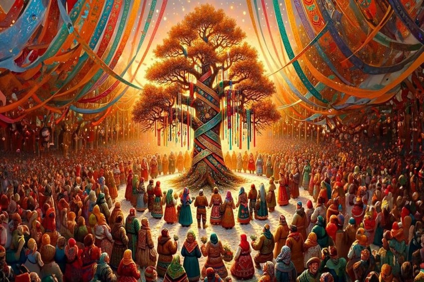 Güzel giysiler giyiliyor. Ağacın etrafında şarkılar söyleyip oyunlar oynuyorlar.