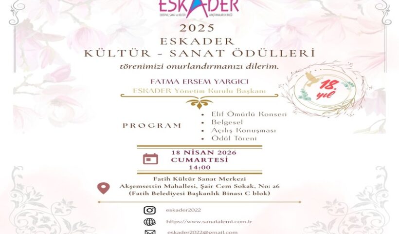 ESKADER 2025 Kültür Sanat Ödülleri, bu hafta Fatih’te sahiplerine verilecek. Fatih Belediyesi Kültür Sanat Merkezi’nde gerçekleşecek olan ödül töreni, 18 Nisan 2026 Cumartesi günü saat…