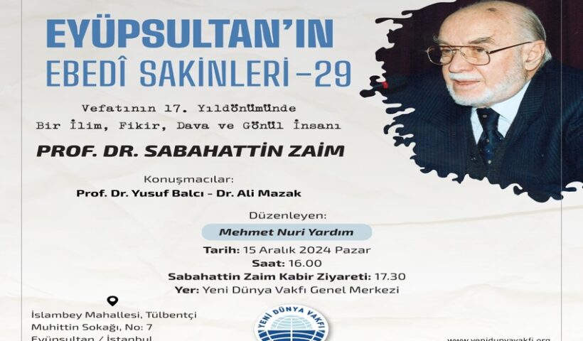 Türkiye’nin sevilen ilim, fikir, dava ve gönül insanı Prof. Dr. Sabahattin Zaim, vefatının 17. Yıldönümünde Eyüpsultan’da rahmetle yâd edilecek.