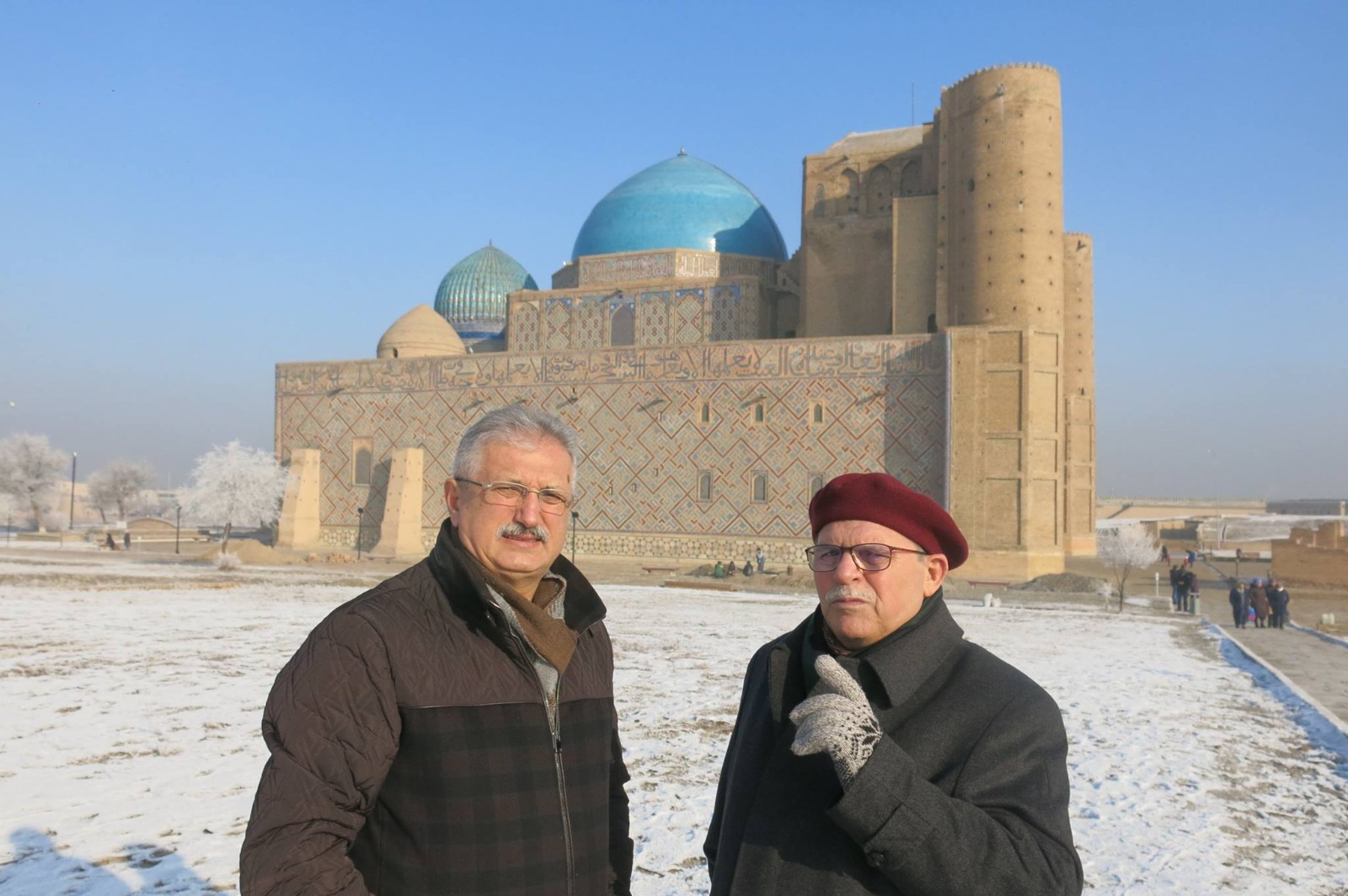 Hoca Ahmed Yesevi Türbesi önünde Fahri Tuna ve Bekir Soysal. 24.12.2017.